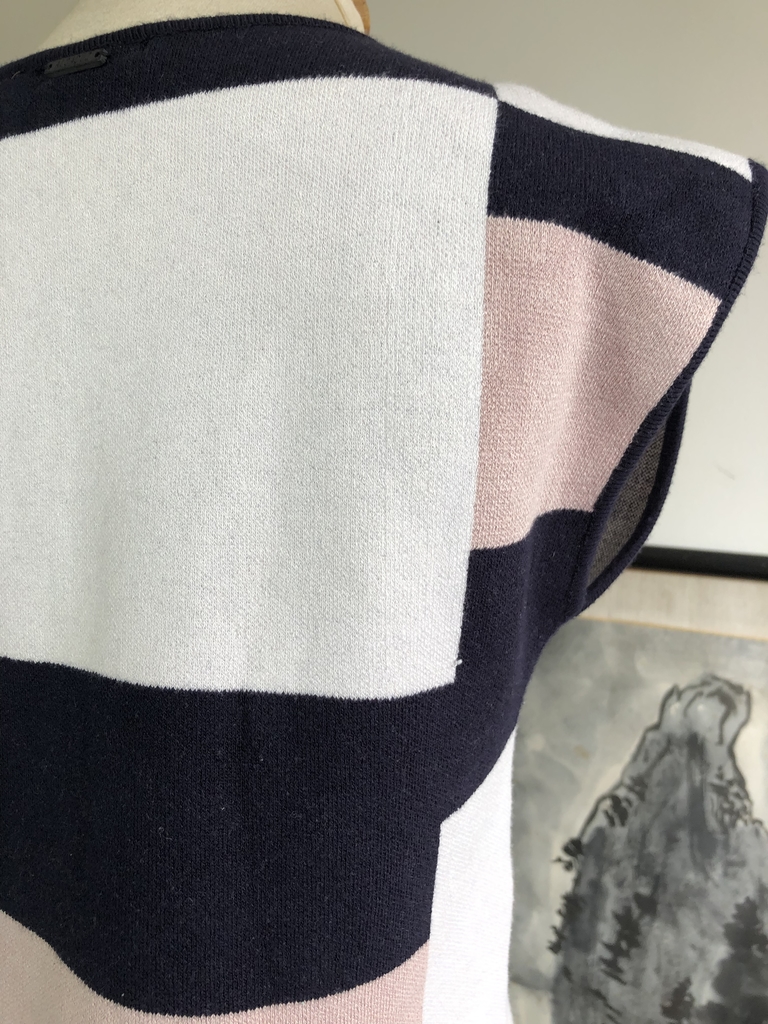 Blusa em tricô de verão cropped com desenhos geométricos nas cores rosa marinho e branco em muito bom estado marca Alcaçuz Tam PP Busto 88 cm Cintura 80 cm Comprimento 45 cm Ref 5706