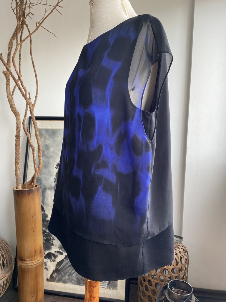 Blusa em tecido misto duplo, preto embaixo e uma sobrepeça em estampada azul, sem mangas, em estado de novo, importada, da marca Tahari Tam M Busto 122 cm Cintura 110 cm Comprimento 66 cm Ref 6033
