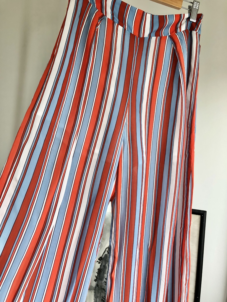 Calça pantalona em 100% viscose listrada em azul laranja e branco, com forro em poliéster, comfy, em ótimo estado, marca Scarf Me Tam 36 Cintura 70 cm Quadril 118 cm Comprimento 114 cm Ref 5704