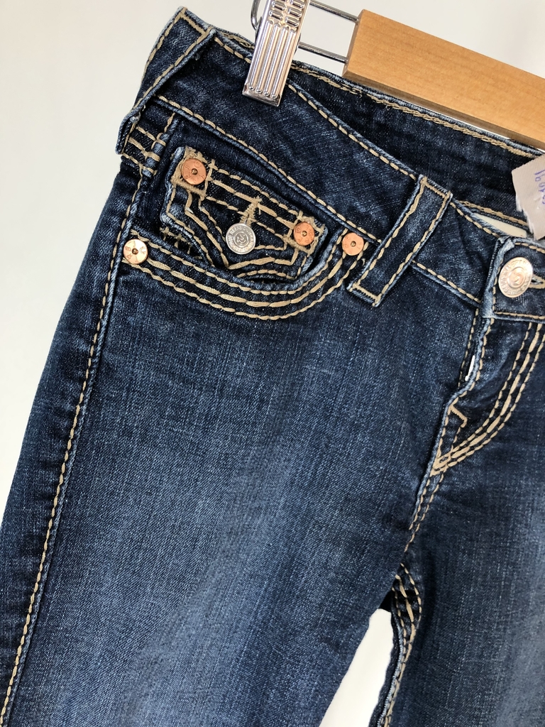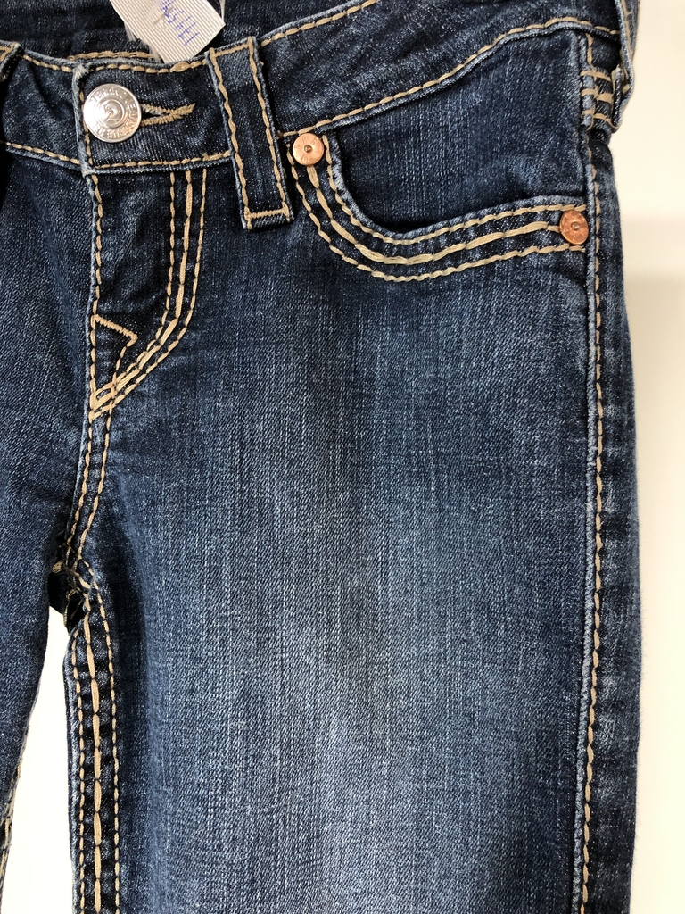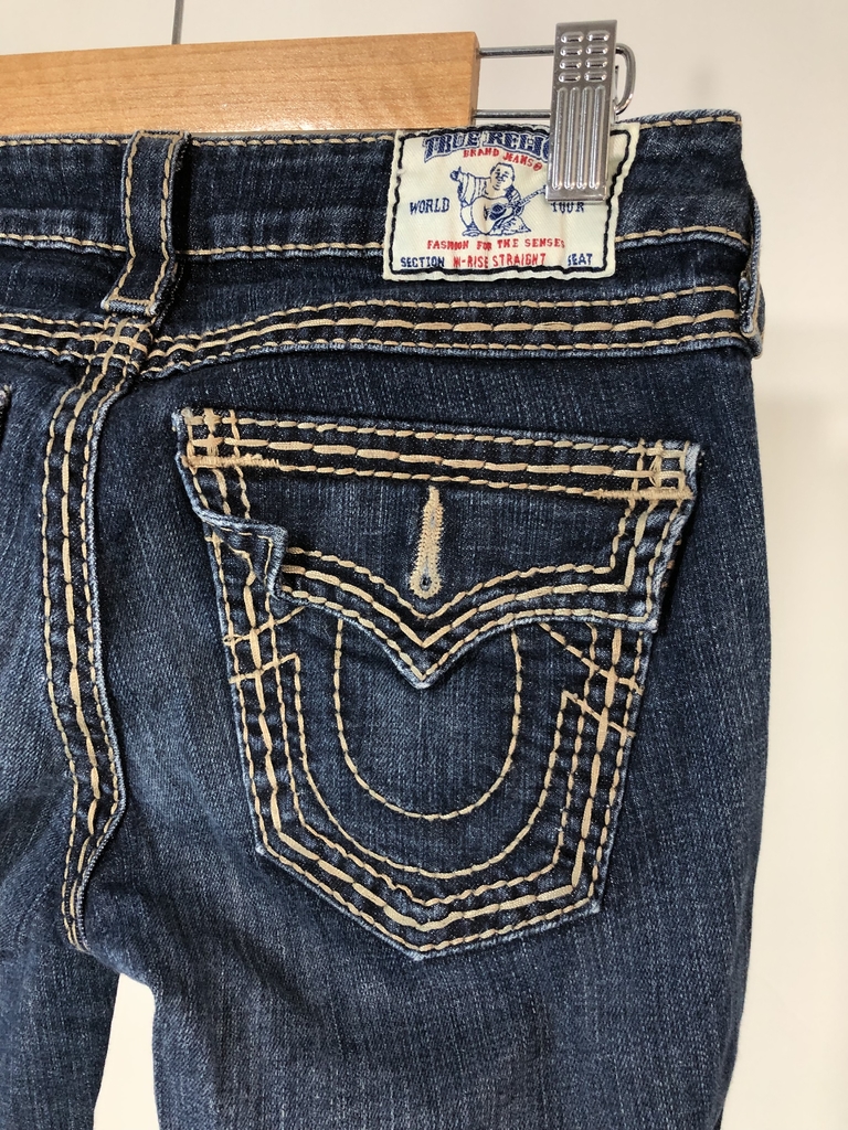 Calça jeans azul detalhes bolsos frontais traseiros, ziper, marca americana True Religion Tamanho 26 BR 37 Cintura 72 cm Quadril 84 cm Gancho 19 cm Entrepernas 73 cm Comprimento 92 cm |