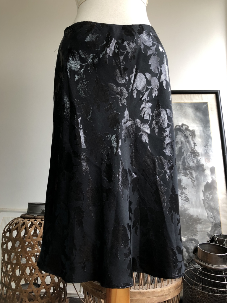 Saia em tecido adamascado preto em 85% seda e 15% nylon com forro em poliéster, ligeiramente evasê, em ótimo estado, marca DKNY